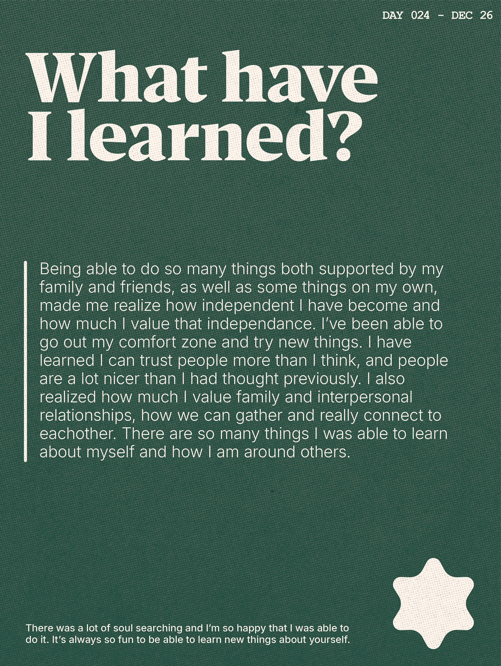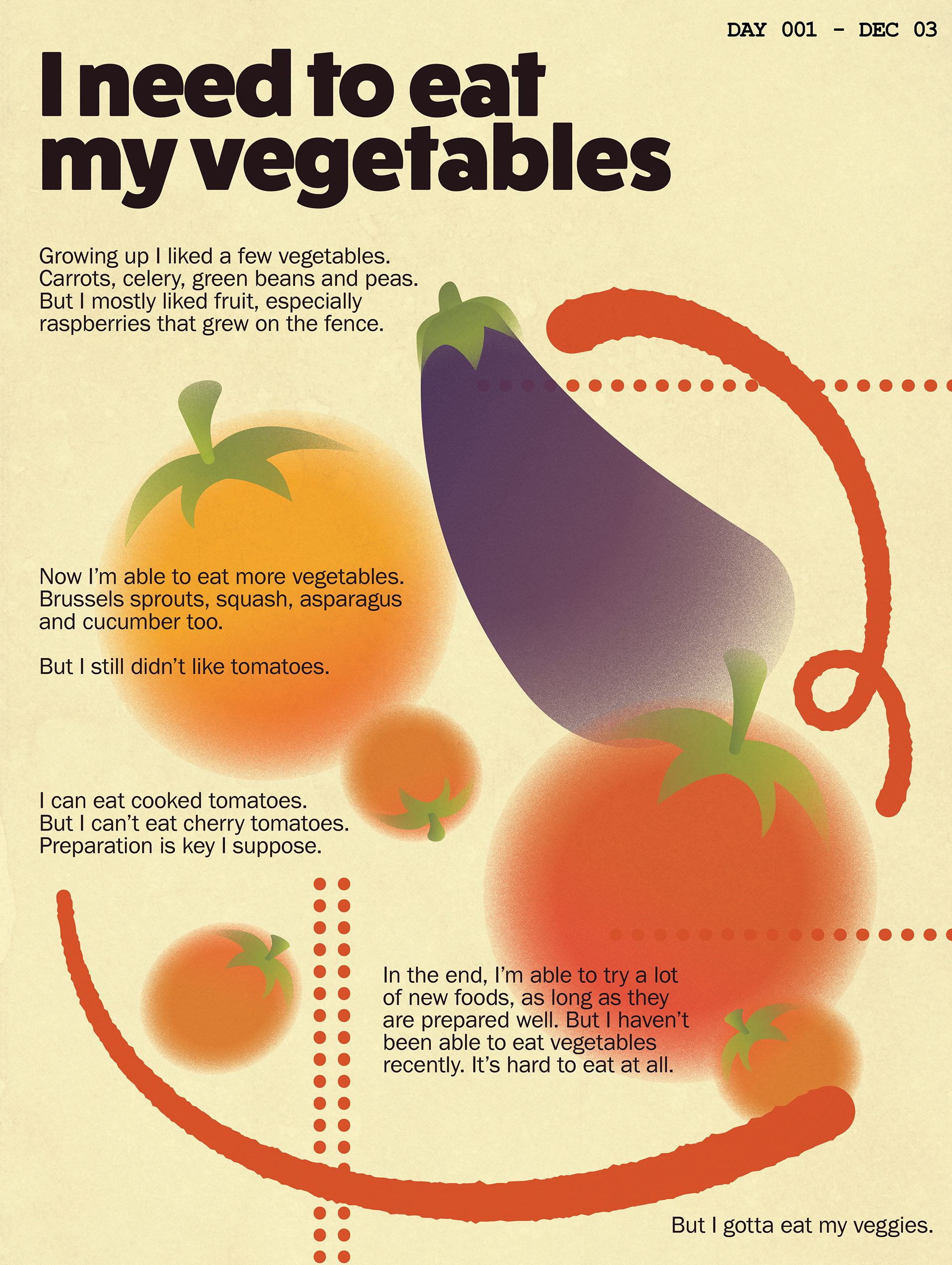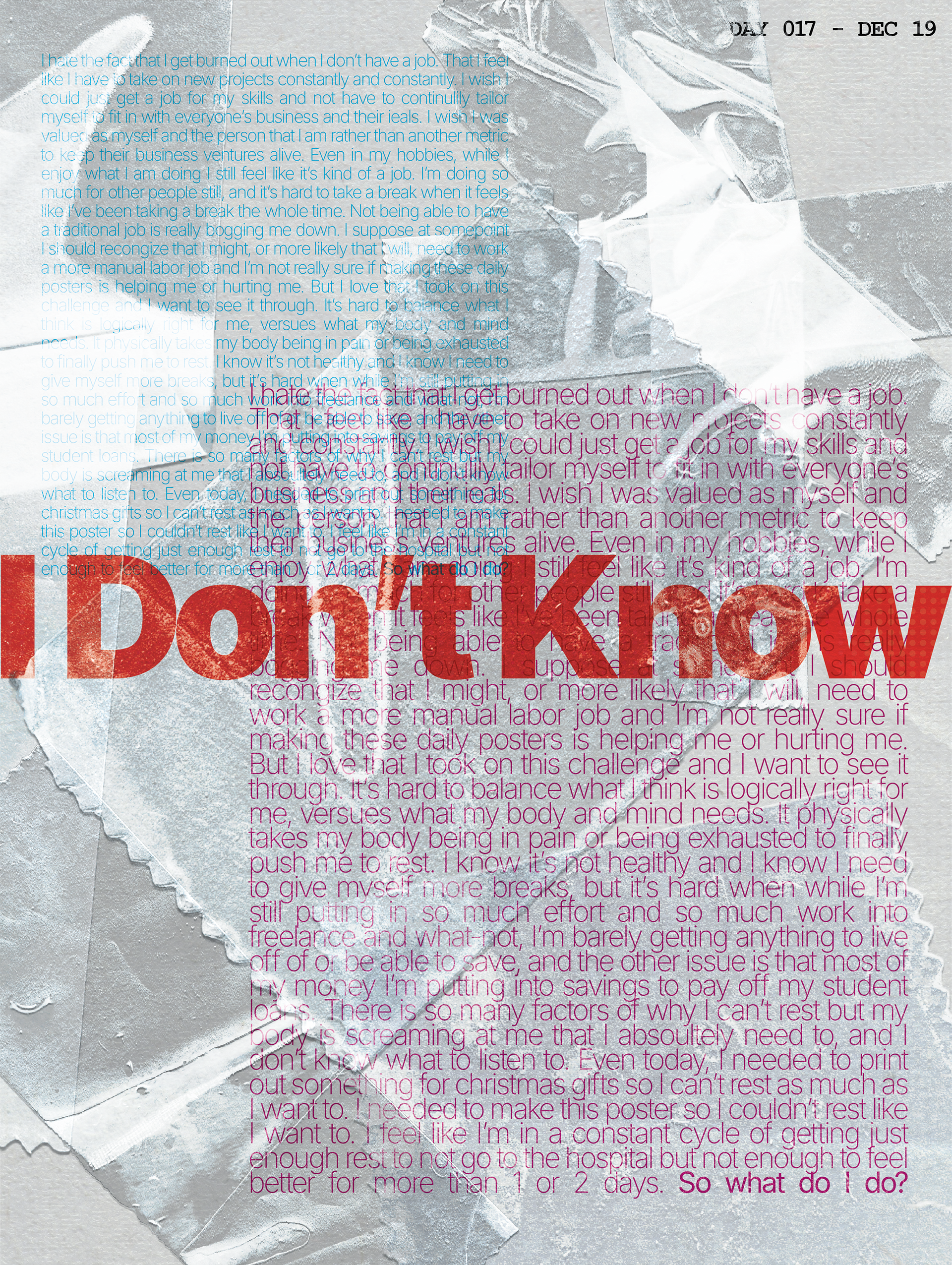 During the month of December, I took on the challenge to create one poster everyday for as long as I could. I found that creating an interesting poster that relayed a message was a huge task. I ended up spending between 2-4 hours per poster, and often it was difficult to keep up with it and my other projects. Though I don't think I will continue this challenge, it was a great exploration into stepping out of my comfort zone, and reigniting my creativity with art and design.